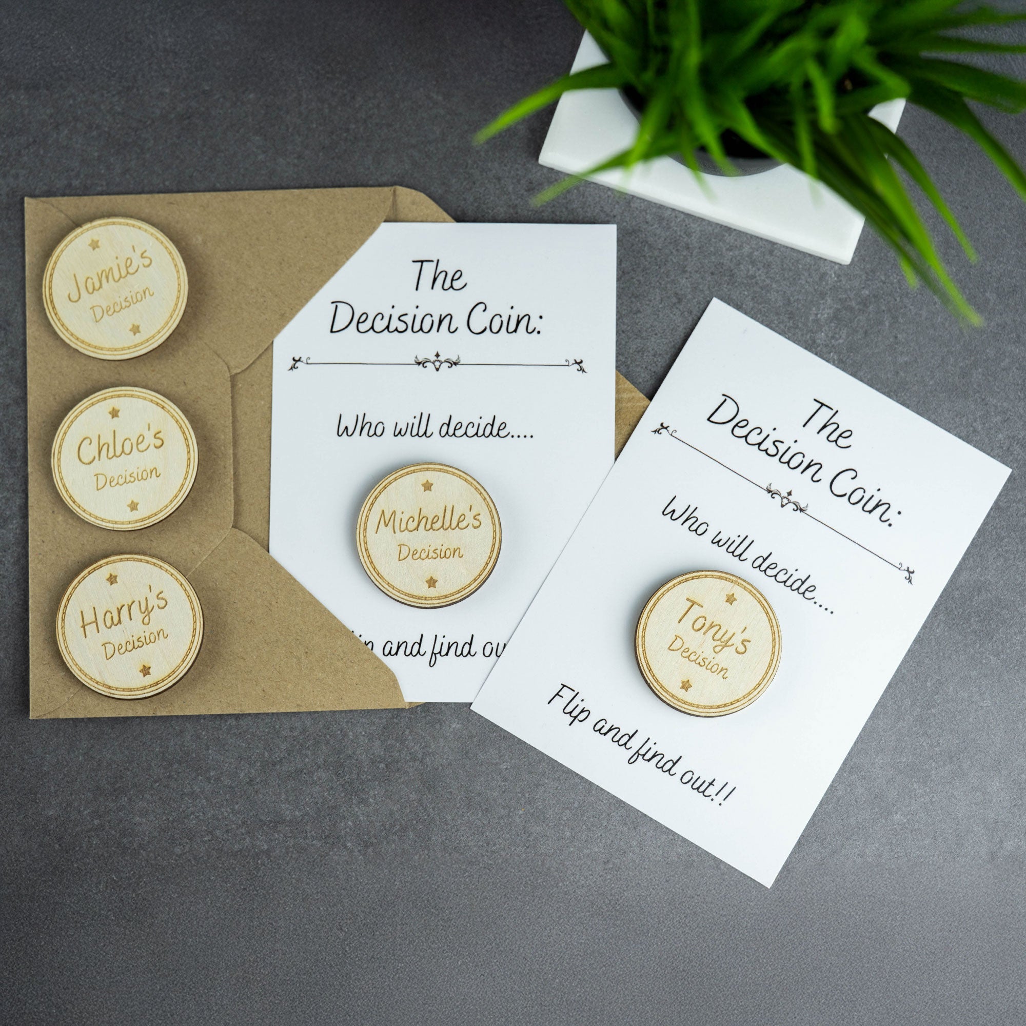 To make gift giving even more special, we provide a envelope and card with every Personalised Decision Coin!