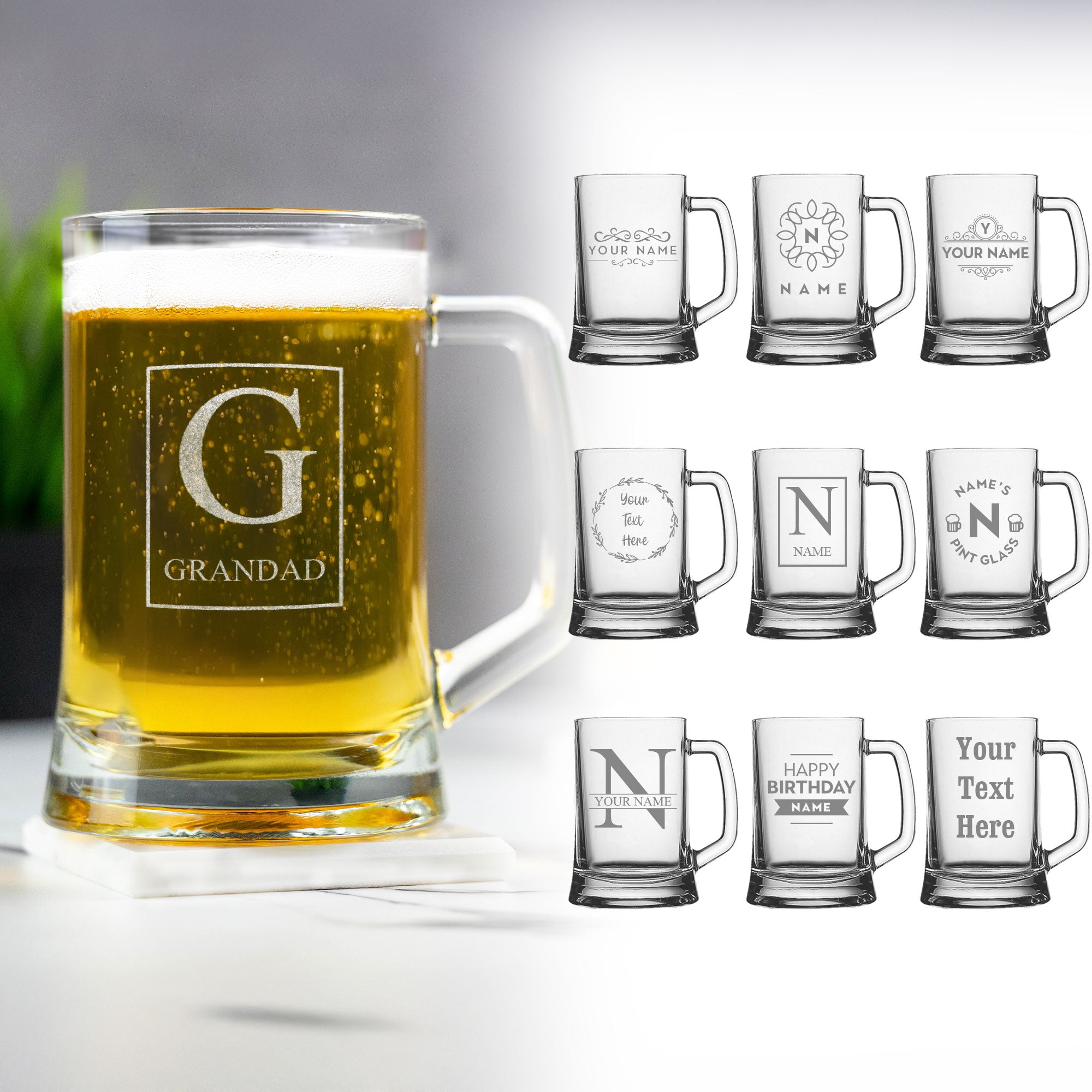 Our high quality 23oz large glass beer tankards are professionally laser engraved, leaving a permanent frosted mark....